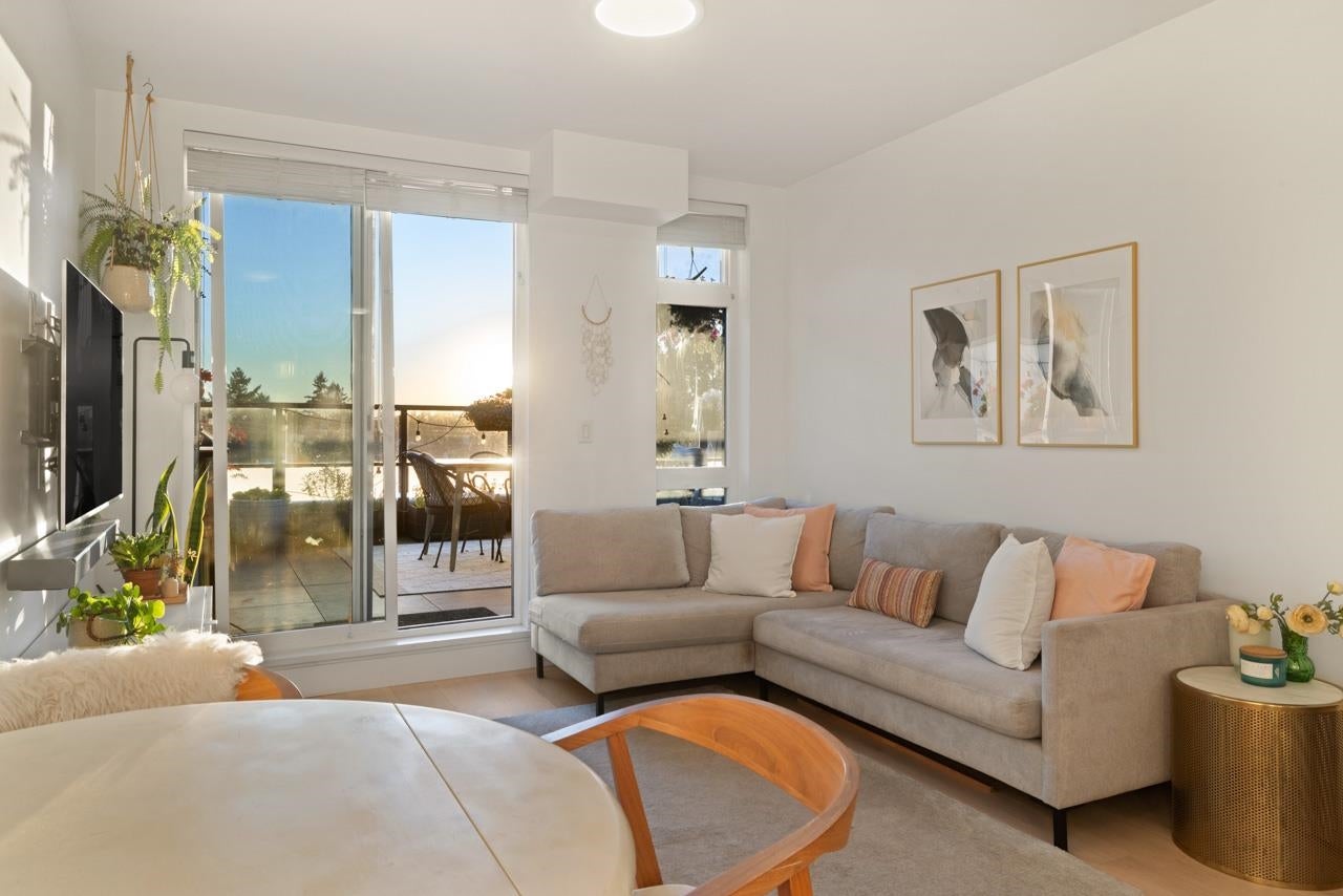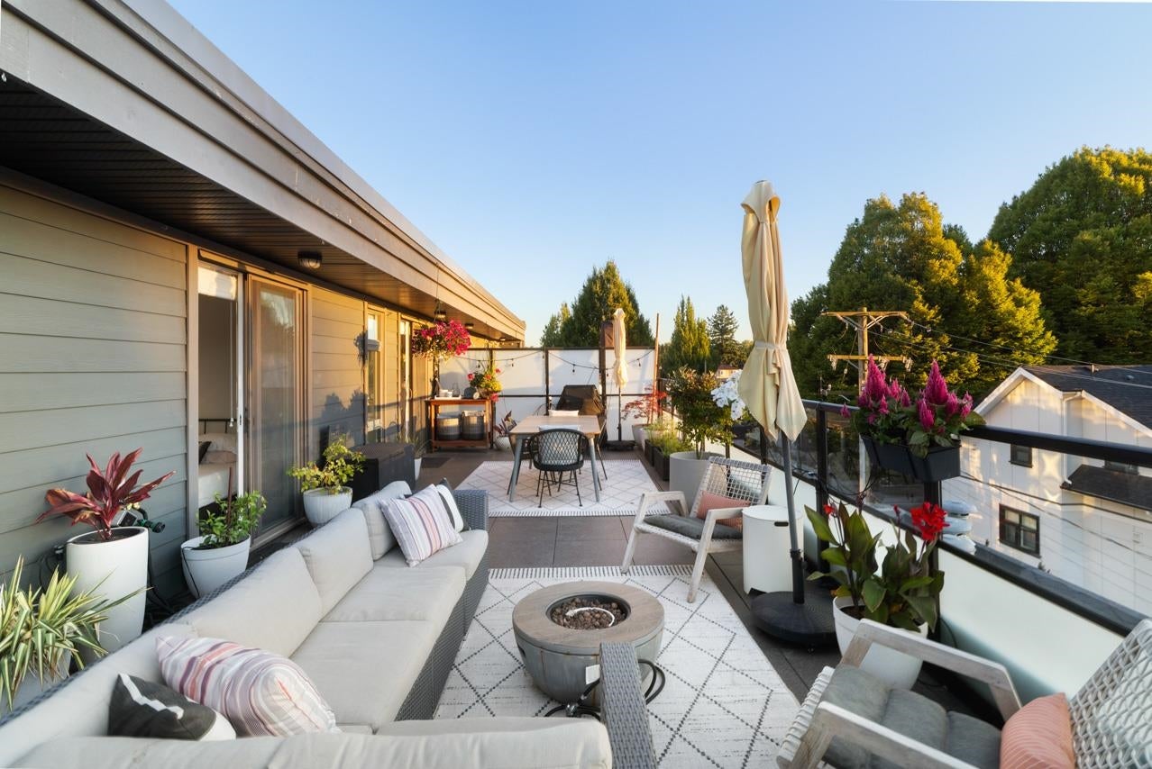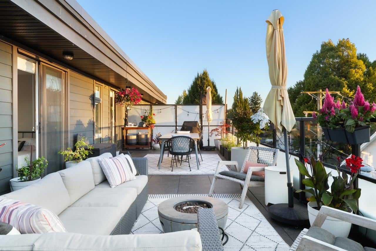 Make your penthouse dreams a reality at Kensington Point. A gorgeous 2 bed, 2 bath corner home sits on the top floor of a boutique building located in Cedar Cottage. Find yourself on the quiet side w/the most covetable, almost 500sf, garden-ready patio to enjoy the sun set over the city & panoramic views of the mountains. The bright interior offers open concept living w/a spacious layout. Light fills the space through floor-to-ceiling, west-facing windows & a perfectly placed skylight in the kitchen. Built in 2017, PH2 is well maintained featuring engineered hardwood floors, custom closets, quartz countertops, SS appliances & Miele W/D combo. A blend of comfort, style & everyday practicality. Comes with 1 parking, 1 storage room + bike locker. Steps to great shops & restaurants.