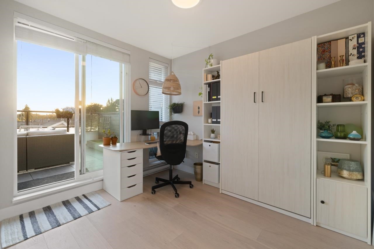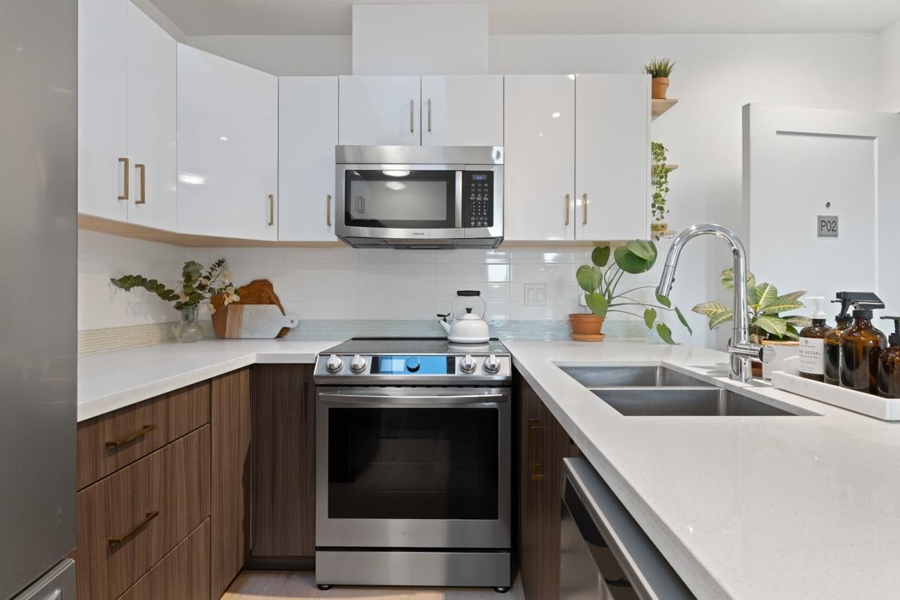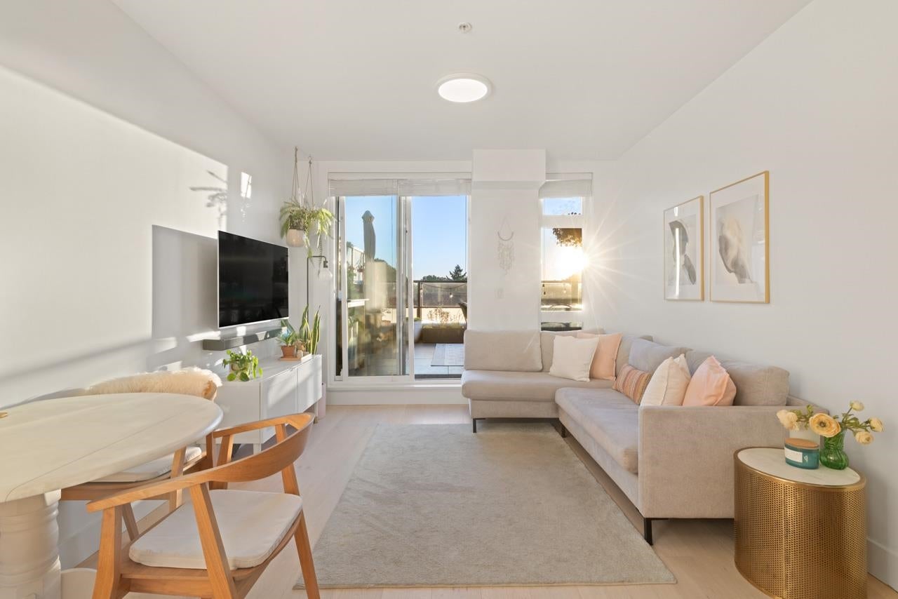 Make your penthouse dreams a reality at Kensington Point. A gorgeous 2 bed, 2 bath corner home sits on the top floor of a boutique building located in Cedar Cottage. Find yourself on the quiet side w/the most covetable, almost 500sf, garden-ready patio to enjoy the sun set over the city & panoramic views of the mountains. The bright interior offers open concept living w/a spacious layout. Light fills the space through floor-to-ceiling, west-facing windows & a perfectly placed skylight in the kitchen. Built in 2017, PH2 is well maintained featuring engineered hardwood floors, custom closets, quartz countertops, SS appliances & Miele W/D combo. A blend of comfort, style & everyday practicality. Comes with 1 parking, 1 storage room + bike locker. Steps to great shops & restaurants.